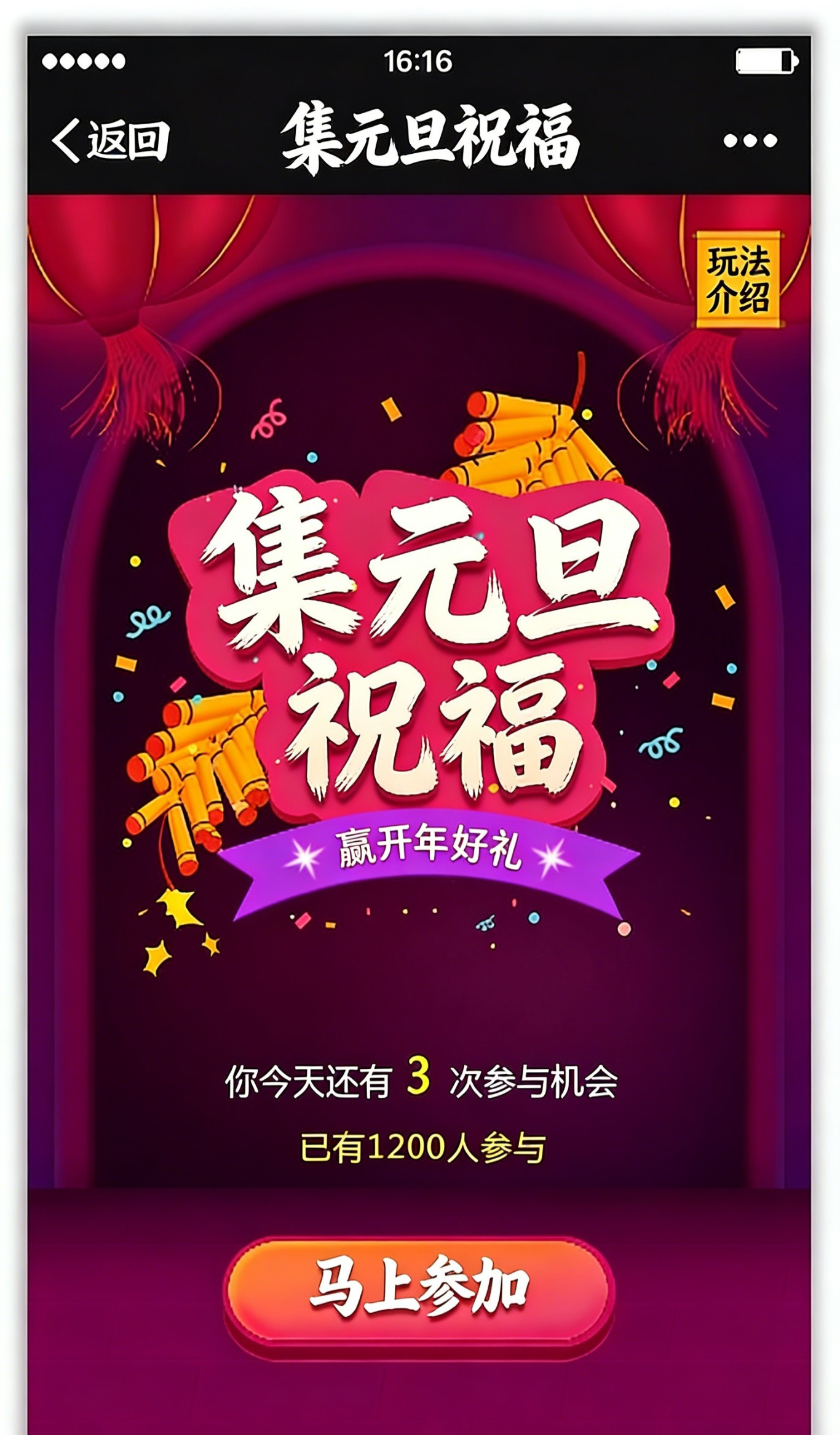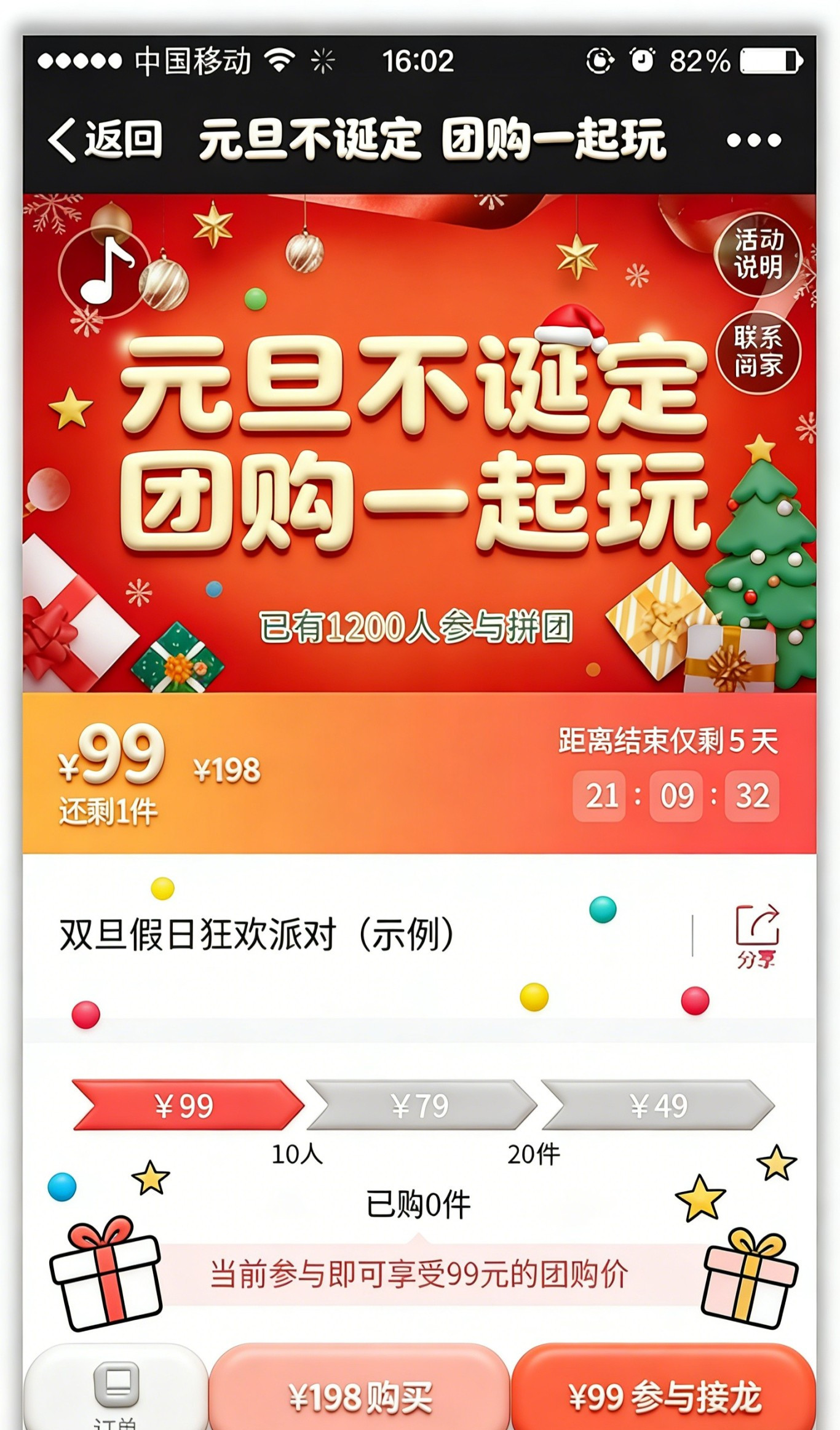 (拼团活动) 发起#我的新年计划#等话题,结合投票活动,用户晒图有机会获得元旦福气大礼包;