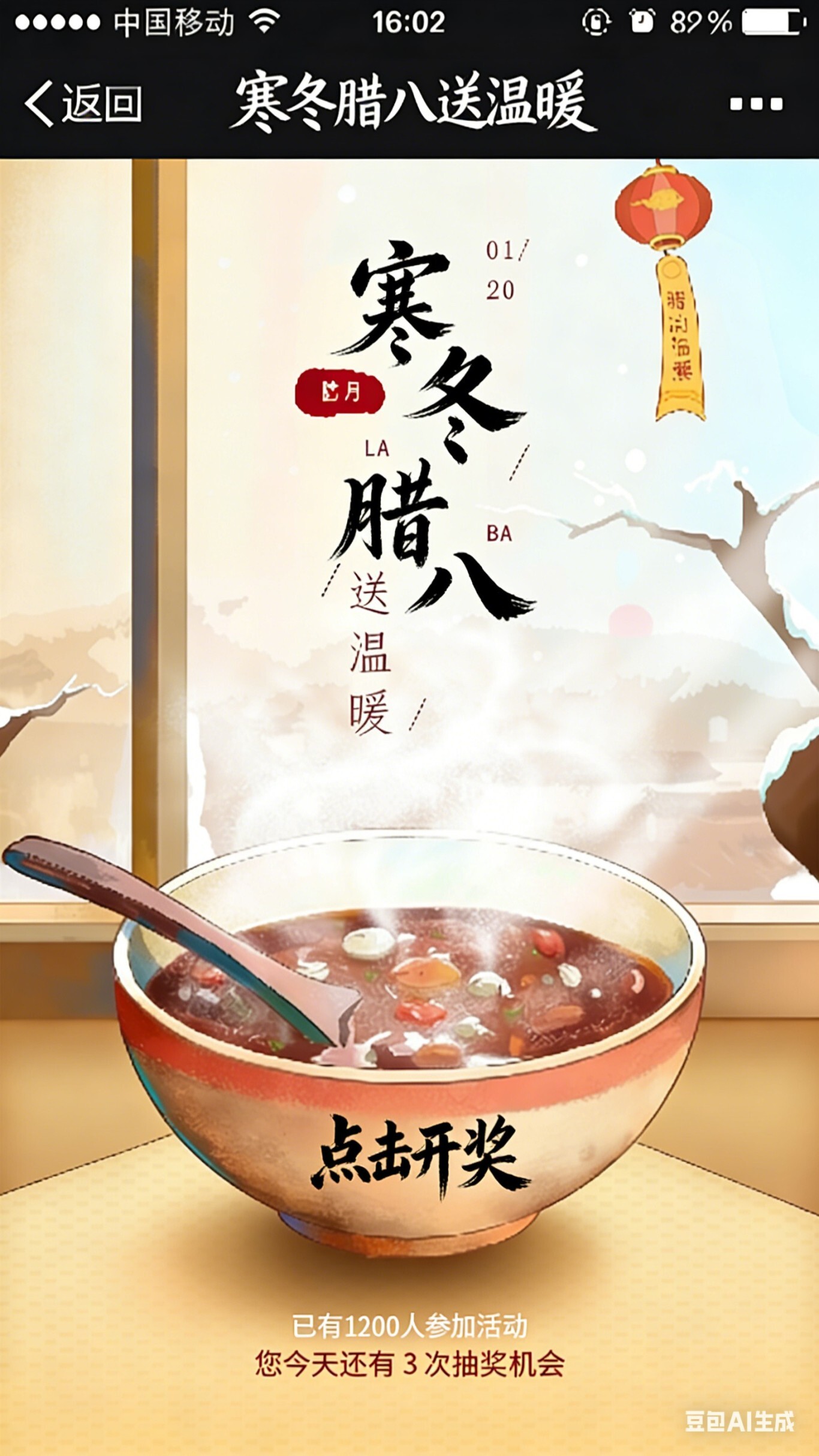 (腊八节助力) 以腊八送温暖为主题,结合抽奖玩法,吸引用户参与活动,进行品牌推广