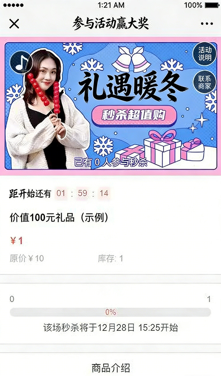 (秒杀活动) ![]() 温暖营销 主推腊八节优惠套餐,结合小游戏,以免单、优惠券等吸引用户参与;