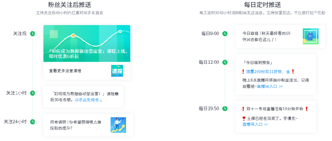 支持等待发送,如关注半小时,4小时后连续发送,转化更高效。